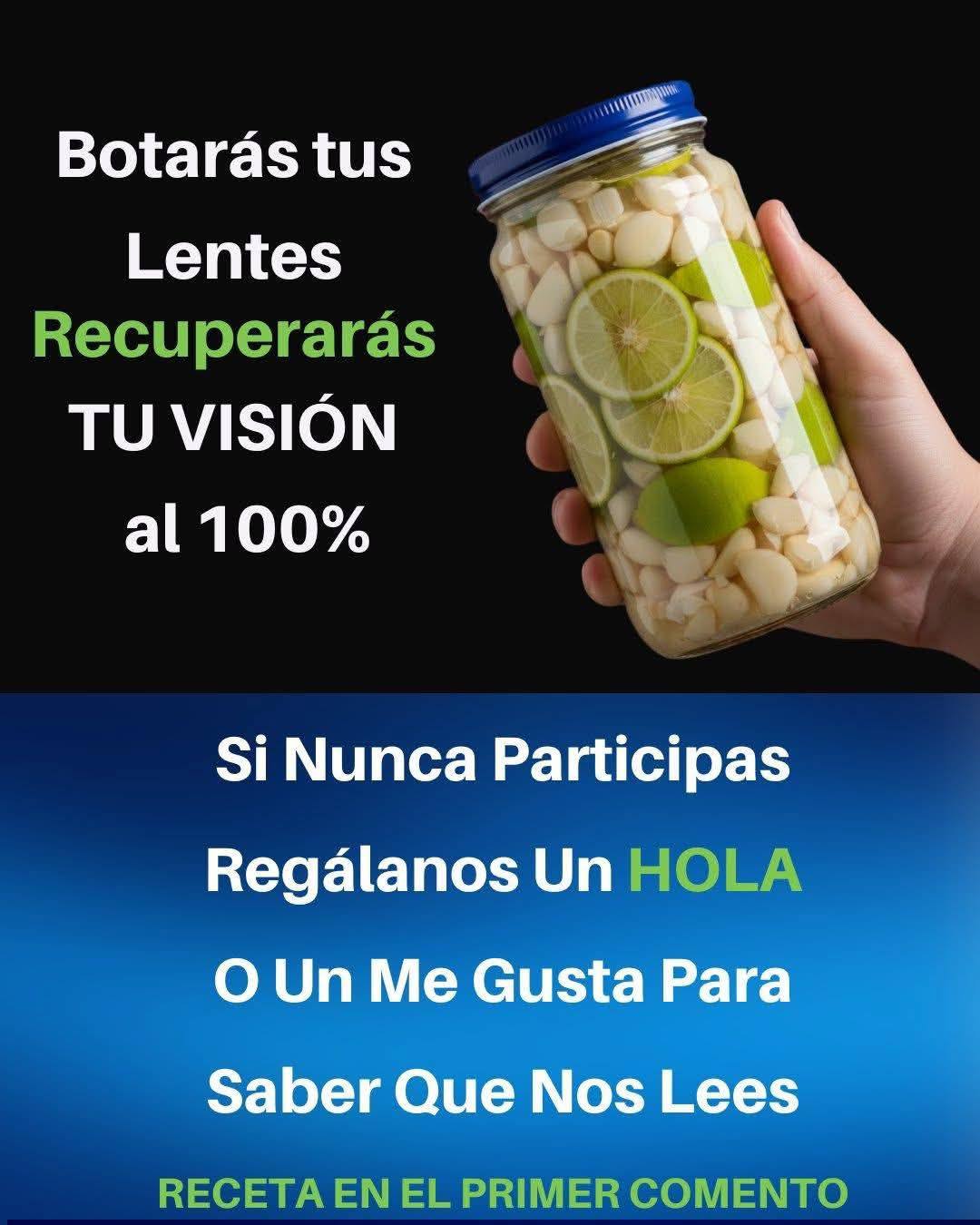 Receta principal: Infusión de ajo con limón para la visión Ingredientes: 2 limones verdes medianos. 5 a 6 dientes de ajo frescos. 1 vaso de agua tibia (250 ml). 1 cucharadita de miel (opcional). Preparación:   Para obtener más información, continúe en la página siguiente