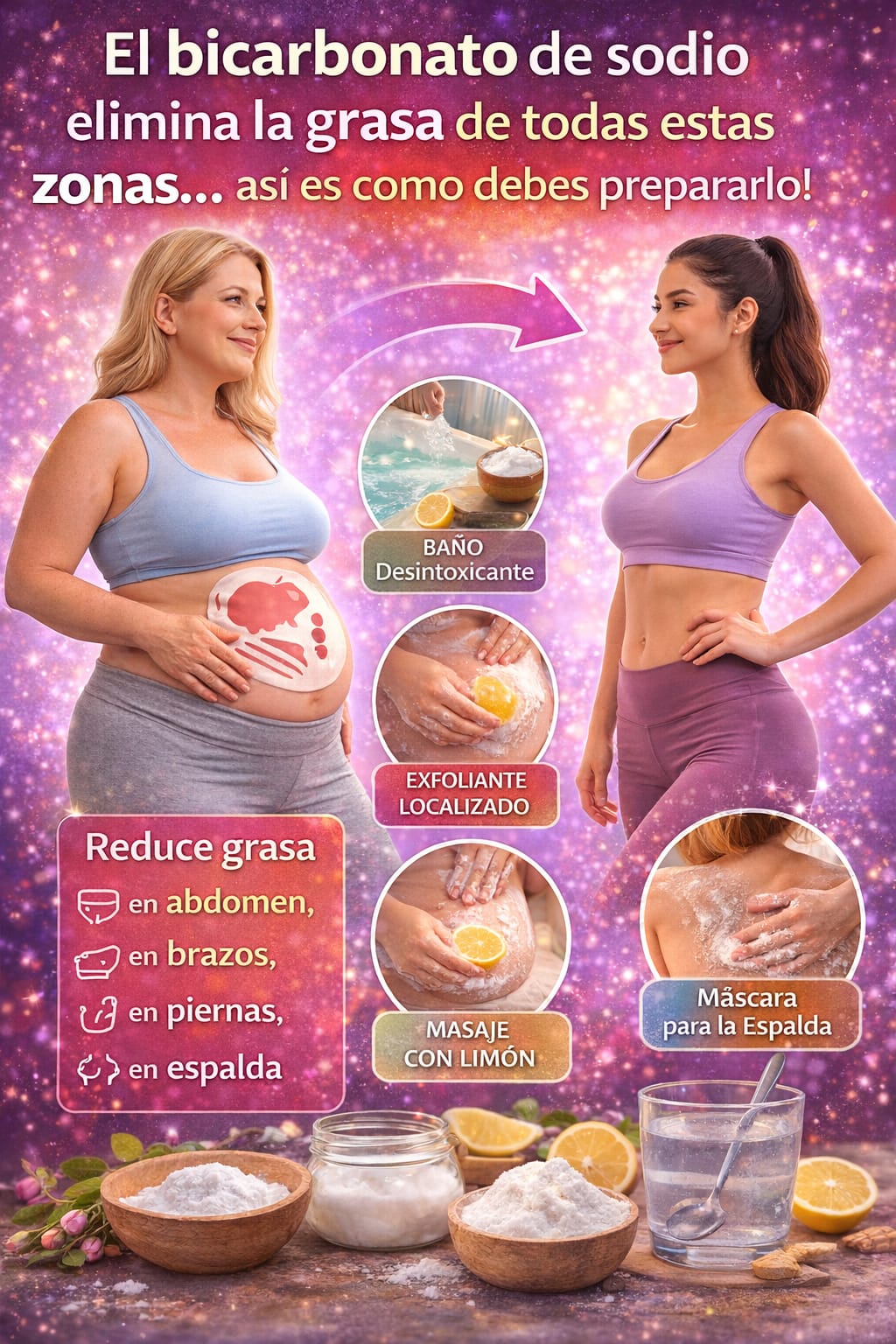 El bicarbonato de sodio es conocido en muchos hogares por sus usos versátiles, desde la limpieza hasta la cocina. Sin embargo, también se ha ganado un lugar en la rutina de belleza y cuidado personal debido a sus propiedades exfoliantes, desintoxicantes y reguladoras del pH. En los últimos años, muchas personas han comenzado a usar el bicarbonato de sodio para reducir la grasa localizada en áreas problemáticas como el abdomen, los muslos, los brazos y la espalda. Si bien no es un remedio milagroso, combinado con hábitos saludables, puede ayudar a mejorar el aspecto de estas zonas. Aquí te explicamos cómo puedes aprovechar el bicarbonato de sodio para reducir la grasa de forma efectiva.