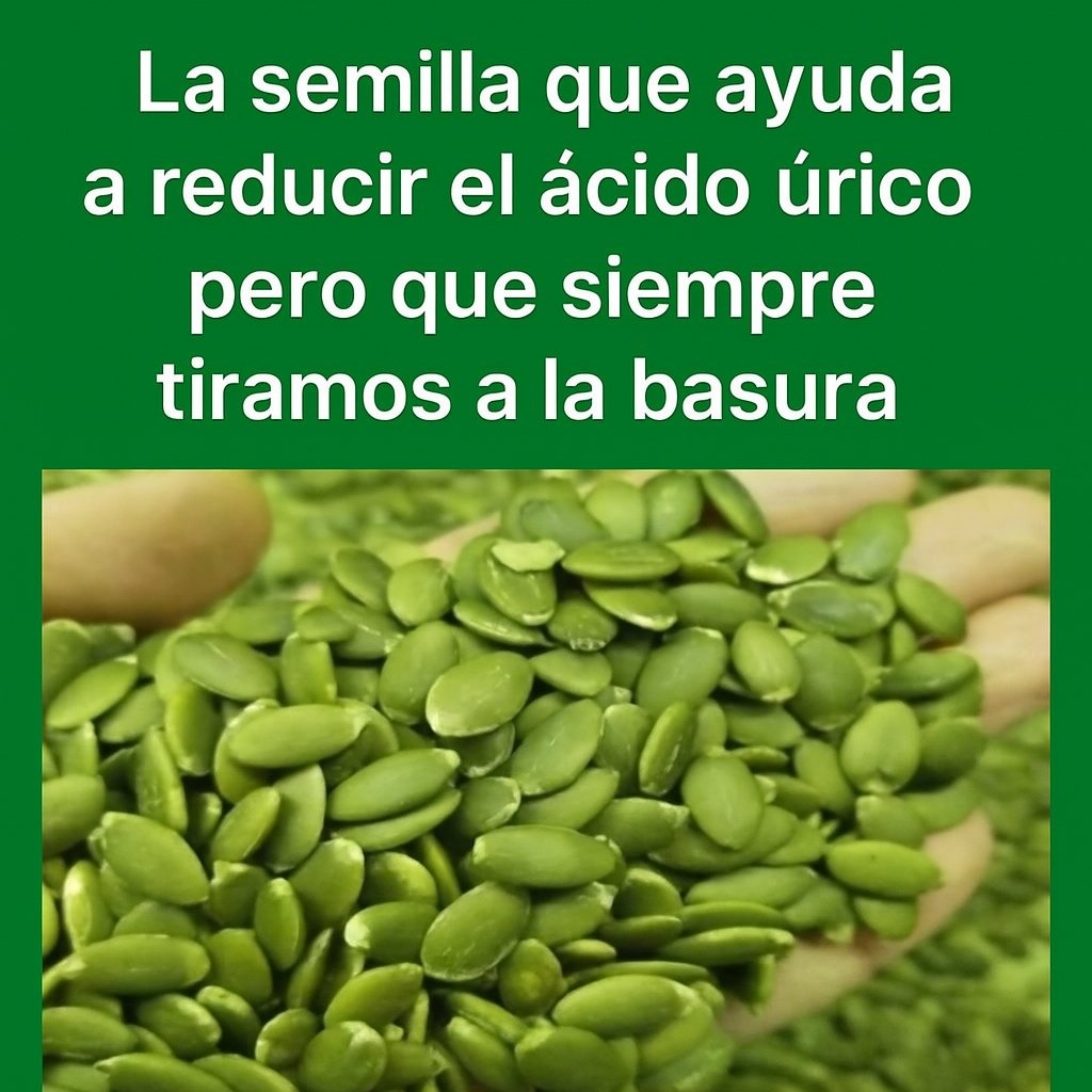 La imagen sugiere que hay una semilla (en este caso, parecen semillas de calabaza) que todos conocemos o desechamos, pero que podría tener beneficios para controlar los niveles de ácido úrico.