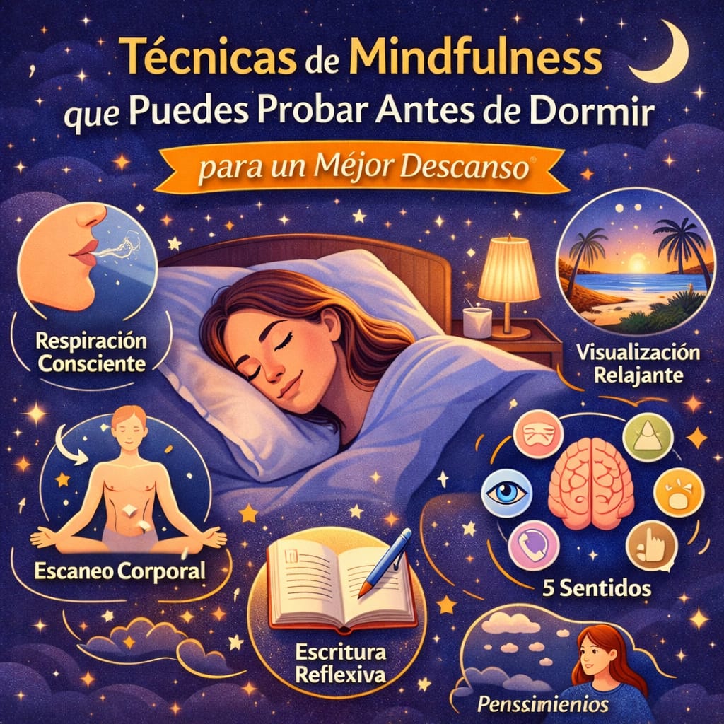 El mindfulness, o atención plena, es una práctica que se centra en estar presente en el momento y aceptar nuestros pensamientos y emociones sin juicio. Esta práctica, cuando se aplica antes de dormir, puede ser muy útil para calmar la mente, reducir el estrés y mejorar la calidad del sueño. Si tienes problemas para relajarte antes de acostarte, aquí te presentamos algunas técnicas de mindfulness que puedes probar para descansar mejor.