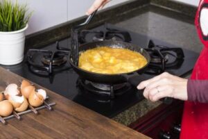Vuelve a poner la tortilla en la sartén para cocinar el otro lado. Puedes dejarla más o menos tiempo según te guste más hecha o más jugosa por dentro.
